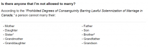 “It’s surprising, maybe, but what a lot of people don’t realize is that they’ve always been allowed to marry first cousins, aunts, uncles, nieces and nephews. But now you can marry pretty much anyone in your family. Desperate times call for desperate measures, eh?