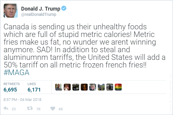 “Canada is sending us their unhealthy foods which are full of stupid metric calories!” he tweeted on Sunday. “Metric fries make us fat, no wunder we arent winning anymore. SAD! In addition to steal and aluminumnm tarriffs, the United States will add a 50% tarriff on all metric frozen french fries!! #MAGA [sic]”